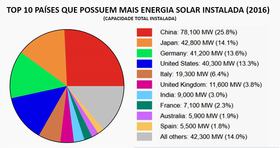 Falaremos sobre os 7 países que mais utilizam a energia solar no mundo. De acordo com os dados aferidos em janeiro de 2017, em primeiro lugar está a China, com 78.100 Megawatts, em segundo lugar vem o Japão com 42.800 Megawatts, em terceiro lugar aparece à Alemanha com a captação de 41.200 Megawatts, na quarta colocação os Estados Unidos com 40.300 Megawatts, em quinto vem a Itália com 19.300 Megawatts, na sexta posição o Reino Unido com 11.6 Megawatts e na sétima colocação no ranking vem a Índia com 9.000 Megawatts de captação. No Brasil, a captação é muito baixa, ainda está longe no ranking e não aparece na lista.